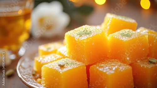Colorful Square Sweets on a Plate with Soft Lighting Background
