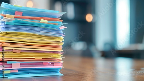 Colorful Stack of Paper Files with Sticky Notes on a Wooden Desk