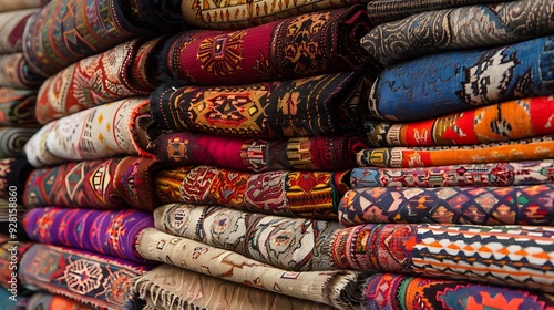 Colorful stack of rugs in various patterns and designs, likely from a shop or market. These rugs are a traditional and cultural item.