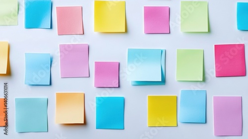 Colorful sticky notes and paper tabs organized on a white desk in a creative workspace
