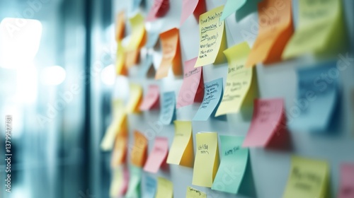 Colorful sticky notes arranged on a wall as part of brainstorming session in modern office setting during daylight hours