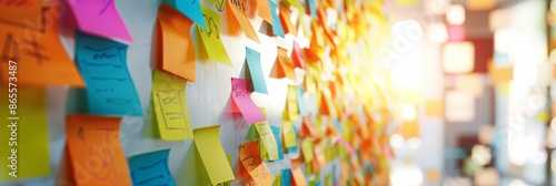 Colorful sticky notes on a wall with sunlight streaming in. Perfect for business brainstorming and planning sessions