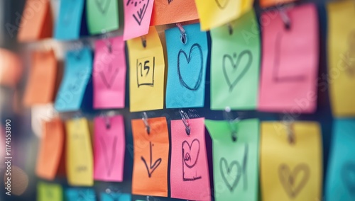 Colorful Sticky Notes with Handwritten Messages on Wall, Close-Up Shot of Text and Detailed Texture, Vibrant Paper in Natural Daylight