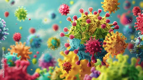 Colorful Stylized Viruses Floating in a Sky Background Representing Microbiology and Disease Awareness