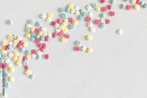 Colorful sugar sprinkles, candy, baking decorations, stars on white background. Flat lay, top view, copy space