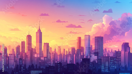 Colorful sunset over a bustling city skyline with tall buildings and vibrant clouds