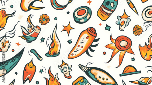 Colorful Tattoo Flash Design Pattern; Seamless background for website or fabric