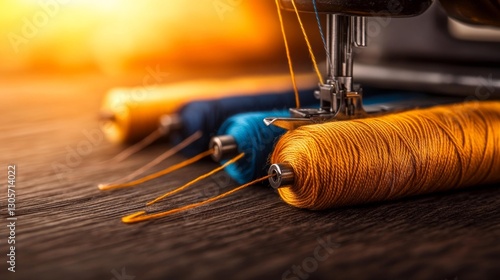 Colorful thread spools and sewing machine with bright threads in a cozy workspace. Generative AI