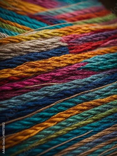 Colorful threads of yarn or rope in various shades of blue, green, yellow, orange, and red, creating abstract and vibrant pattern