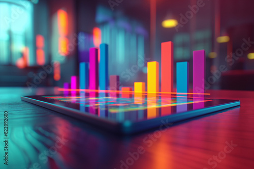 Colorful three-dimensional bar graph on a digital tablet screen, with a bokeh light effect in the background.