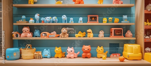 Colorful toy figurines arranged on wooden shelves against a light blue wall.