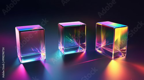 Colorful translucent cubes floating in a dark space, reflecting light with mesmerizing iridescence and striking patterns