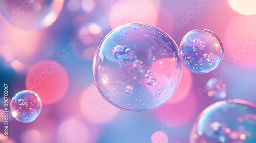Colorful Transparent Soap Bubbles Floating in the Air with Soft Bokeh Light Effects
