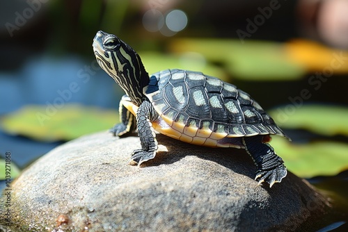 Colorful turtle basking on rock by serene lily pond