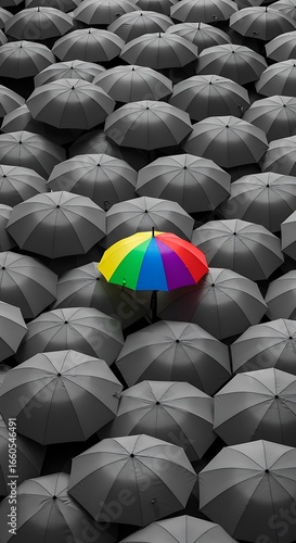 Colorful Umbrella Standing Out in a Crowd of Gray Umbrellas, Symbol of Individuality and Diversity