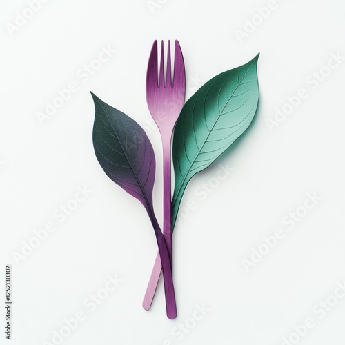 Colorful utensils and leaves on white background. Possible use stock photo for food, eco-friendly products