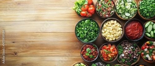 Colorful variety of prepared food in small bowls.