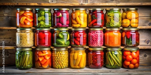 Colorful vegetables in a stack of canned jars on a wooden shelf, food storage