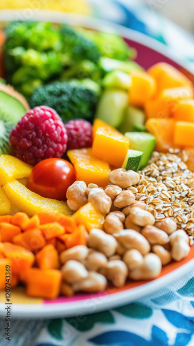 Colorful vegetarian buddha bowl with chickpeas, raspberries, broccoli and oats promoting healthy eating
