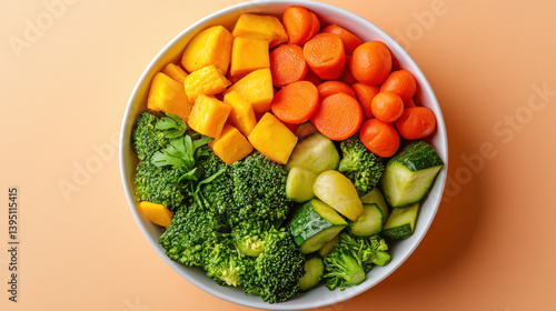 Colorful veggie stir fry featuring vibrant carrots, broccoli, and cucumbers in white bowl, evoking freshness and health