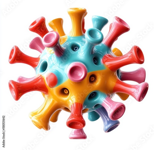 Colorful, vibrant, cartoonish 3D-style logo of the virus, depicting its shape and color with a white background