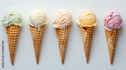 Colorful waffle cone loaded with four distinct scoops of ice cream isolated on white background