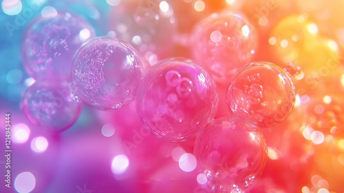 Colorful water balloons arranged on a reflective surface, glowing with vibrant lights, symbolizing festive joy and playfulness. High quality illustration