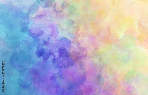 Colorful watercolor background of abstract blotches of painted colors of blue green purple orange pink and yellow, bright color splash background in creative design