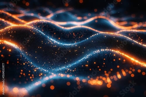 Colorful wave patterns create a mesmerizing digital landscape with glowing particles in a dark background during a late-night ambiance