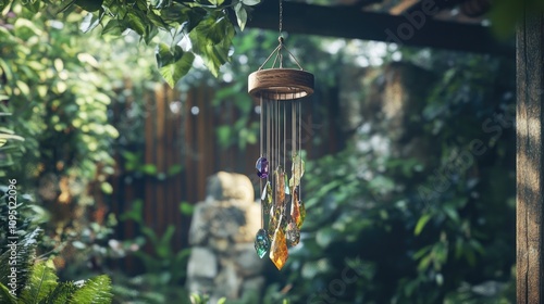 Colorful wind chimes glisten in the sunlight, swaying gently in a lush garden oasis surrounded by vibrant plants and calming nature sounds