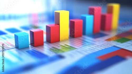 Colorful wooden blocks form a bar graph on a financial report, representing growth and success.