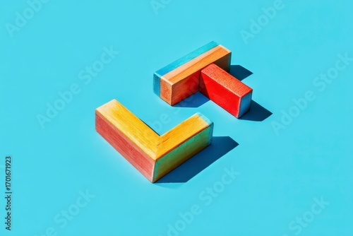 Colorful wooden puzzle pieces forming the letter "L" on a bright blue background
