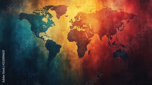 Colorful world map illustration with vibrant hues, showcasing continents against a textured background
