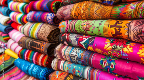Colorful woven textiles stacked neatly, showcasing vibrant