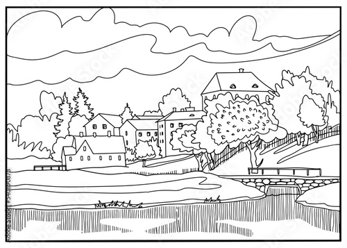Coloring book . Lovely landscape, city view across the river. Vector art line background.