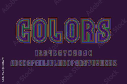 Colors alphabet with numbers and currency signs. Iridescent retro font.