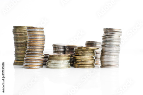 Columns of coins of Russian rubles on a white background. Outdated Russian currency. Double-headed eagle on the back of coins. Copy