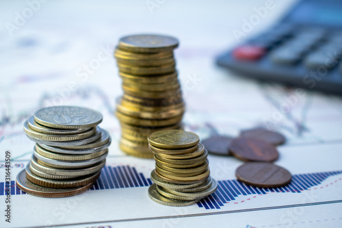 Columns of coins with calculator on chart (diagram) background. Finance content.
