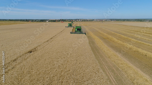 Combine harvester at work harvesting field wheat. Aerial view Combine harvester mows ripe spikelets, barley, rye. Combine harvester harvest ripe wheat on a farm.