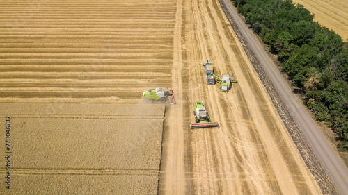 Combine harvesting: aerial view of agricultural machine collecting golden ripe wheat into truck.