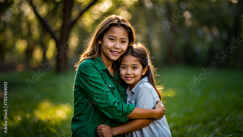Comfort in Color: Warm and Gentle Hug from sister, Set Against a Serene Green Outdoor Background