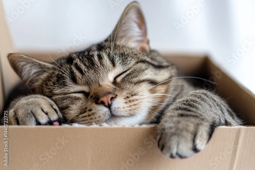 Comfortable cat peacefully napping in a cozy box on a soft white background, Comfortable cat asleep in box, white background, capturing peaceful rest