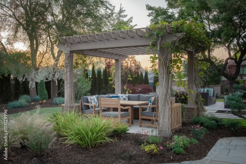 Comfortable pergola providing shade in luxurious backyard during sunset