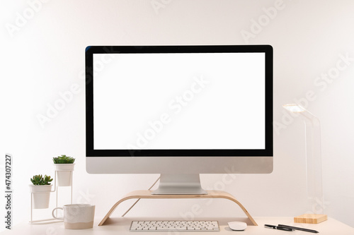 Comfortable workplace with blank computer display on desk against white background. Space for text
