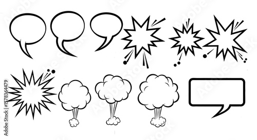 Comic style speech bubbles and effects illustrations. Black and white design elements for text and action representation.