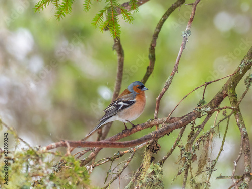 Common chaffinch (Fringilla coelebs) on a fir tree branch