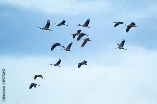 Common cranes, grus grus, in flight with blue sky and white clouds in background. Bird moving during spring migration with copy space. Animal wildlife in the air.