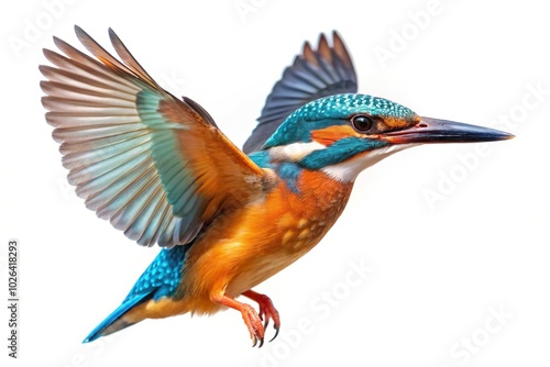 Common flying kingfisher isolated on white background with clipping path focus stacking Point of View