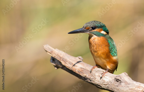 Common kingfisher, Alcedo atthis. The bird sitting on a branch above the water while waiting for fish