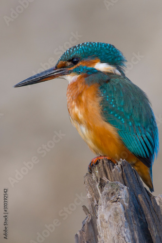 Common kingfisher (Alcedo atthis)Landscape format,female,perched against a diffuse pale brown background,